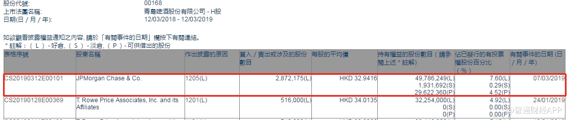 智通财经APP获悉,根据联交所资料显示,摩根大通于3月7日减持青岛啤酒(00168)287万股,每股作价32.94港元,总值约9453.78万港元,最新持股数目4978.6万股,最新持股比例减至7.60%。