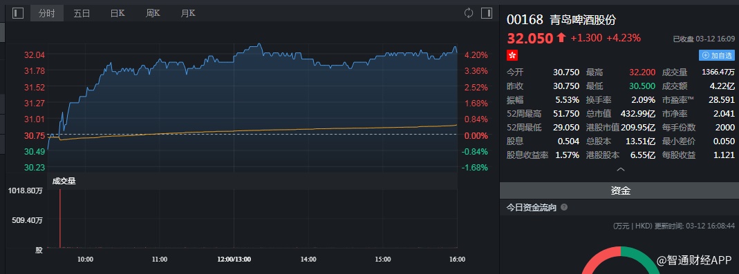 截至今日收盘,青岛啤酒(00168)涨4.23%,报32.05港元。