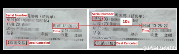 在第二篇报告中,艾默生列出湖南长沙一家铁路商店的详细销售单,指出短期内出现大量的撤销单据。艾默生认为,周黑鸭的声明并不能反驳第一篇沽空报告中所提出的证据。“周黑鸭的说法不能令人信服,实际情况是,指顾客和销售人员无法在10秒内完成销售动作。”