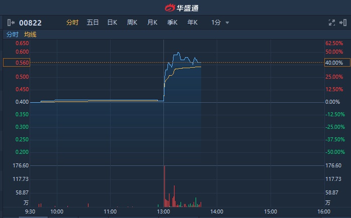智通财经APP获悉,嘉瑞国际(00822)午后直线拉升,一度暴涨50%,截至13时41分,涨40%,报0.56港元,成交额达442.3万港元。