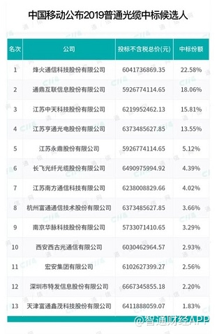 智通财经APP获悉,中国移动(00941)3月12日公示2019年普通光缆产品集中采购中标候选人,共十三名中标候选人,第一名烽火通信投标不含税总价为60.4亿元,中标份额22.58%;通鼎互联中标份额18.06%;中天科技中标份额15.81%;亨通光电中标份额13.55%;长飞光纤(06869)中标份额4.39%;南方通信中标份额4.02%。