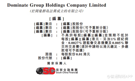 智通财经APP获悉,据港交所披露,3月12日,Dominate Group Holdings Company Limited通过港交所创业板聆讯,南华金融集团为其独家保荐人。