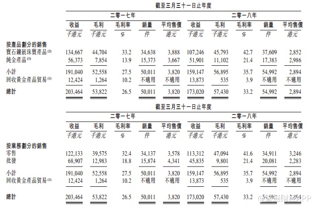 鉴于截至2017年3月31日止年度前的下滑市场趋势,该集团管理层于截至2017年3月31日止年度实施了一系列涉及宝石镶嵌珠宝产品折扣的销售宣传。截至2018年3月31日止,由于市场复苏,因此减少给予客户折扣。反之,该集团专注于出售单位售价较低的珠宝产品,因为该等产品利润率较高。因此,该集团截至2018年3月31日止年度宝石镶嵌珠宝产品及纯金产品的总销量由约50000件增加至55000件,并由截至2017年9月30日止六个月约26000件增加至截至2018年9月30日止六个月的32700件。