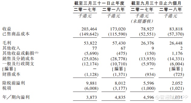 截至2017年及2018年3月31日止年度及截至2017年及2018年9月30日止6个月,该集团收益分别约203.5百万港元、173百万港元、78.9百万港元及83.8百万港元,纯利分别约3.9百万港元、4.8百万港元、4.6百万港元及一百万港元。