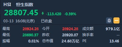 智通财经APP获悉,恒指今日高开低走,早盘微升0.01%,报28924.28点。截至收盘,恒生指数跌113.42点或0.39%,报28807.45点,全日成交额达979.13亿。国企指数跌0.53%,报11405.82点,红筹指数跌0.39%,报4488.23点。