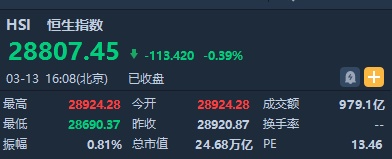智通财经APP获悉,恒指早盘高开微涨0.01%,随后震荡下挫,跌幅一度扩大至0.8%低见28690.37点,午后稍有回暖,跌幅收窄。截至收盘,恒生指数跌113.42点或0.39%,报28807.45点,全日成交额达979.13亿。国企指数跌0.53%,报11405.82点,红筹指数跌0.39%,报4488.23点。