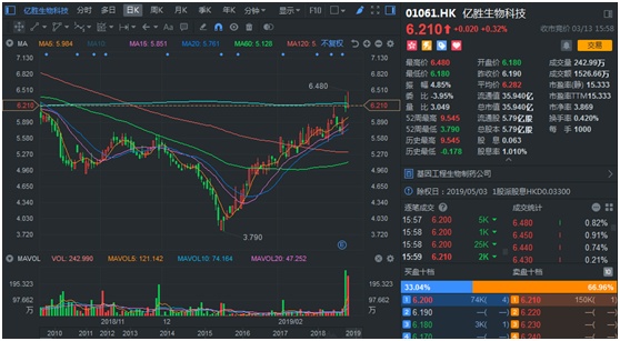 二级市场的神奇,智通财经APP通过前复权计算,亿胜生物科技10年暴涨20多倍,其中,2017年至今,该股累计涨幅接近1倍,成交极度活跃,换手率达到了54.7%,总量达到了3.1亿元股,资金介入痕迹明显。