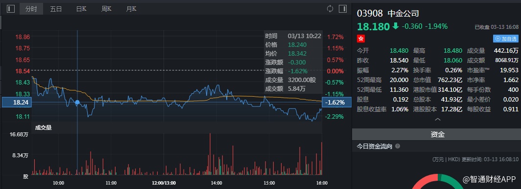 截至今日收盘,中金公司(03908)跌1.94%,报18.18港元。
