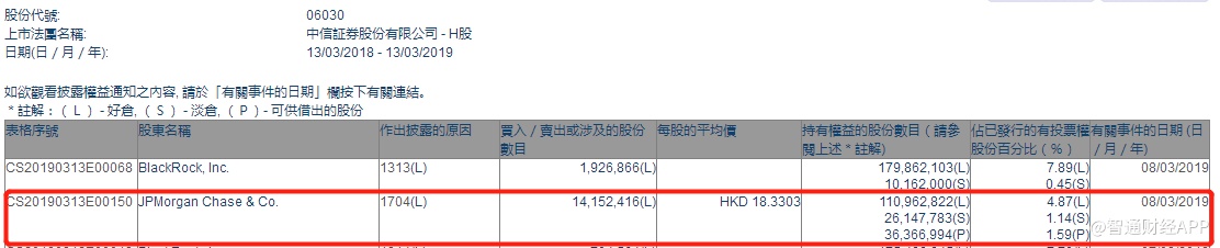 智通财经APP获悉,根据联交所资料显示,摩根大通于3月8日减持中信证券(06030)1415万股,每股作价为18.33港元,总值约2.59亿港元,最新持股数目约1.1亿股,最新持股比例减至4.87%。