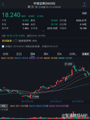 截至今日收盘,中信证券(06030)跌3.18%,报18.24港元。