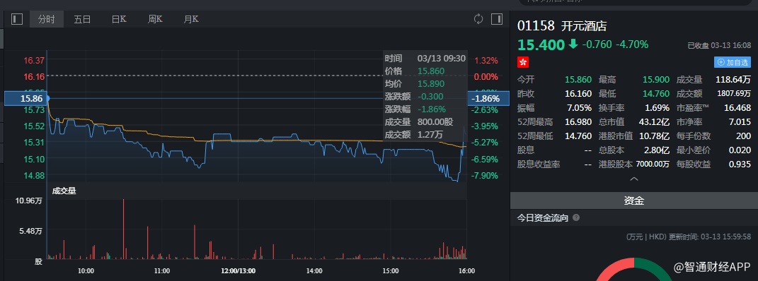 截至今日收盘,开元酒店(01158)跌4.70%,报15.40港元。