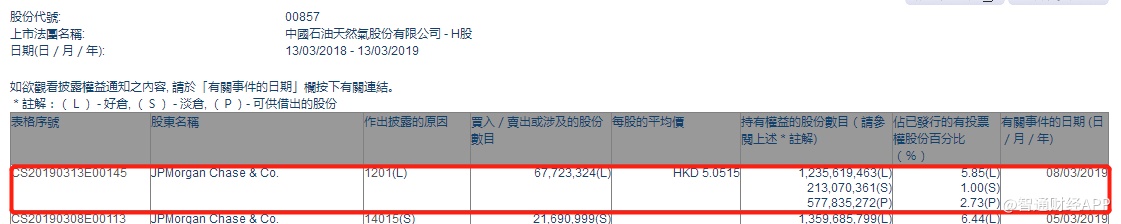 智通财经APP获悉,根据联交所资料显示,摩根大通于3月8日减持中国石油股份(00857)6772万股,每股作价为5.05港元,总值约3.42亿港元,最新持股数目约12.35亿股,最新持股比例减至5.85%。