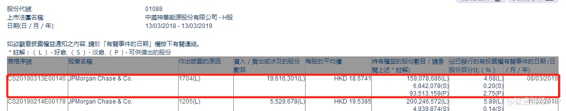 智通财经APP获悉,根据联交所资料显示,摩根大通于3月8日减持中国神华(01088)1961万股,每股作价为18.67港元,总值约3.66亿港元,最新持股数目约1.59亿股,最新持股比例减至4.68%。