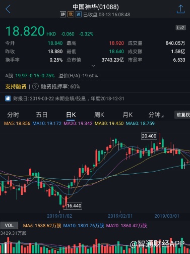 截至今日收盘,中国神华(01088)跌0.32%,报18.82港元。