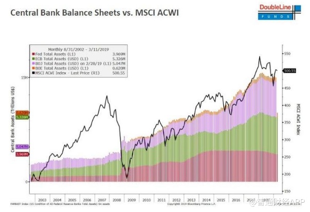 下表展示了全球主要央行资产负债表与MSCI全球市场指数的对比,可作为美联储近期态度“180度转弯”的背景参考。