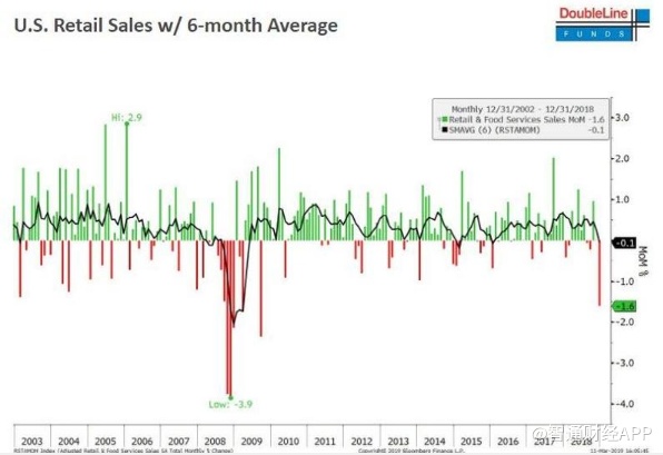 当然,另一个重大危险信号是12月零售数据下修。尽管昨天我们看到,美国1月零售环比反弹,好于市场预期,但冈拉克强调了该数据6个月平均水平的大幅下降,这就是另一个潜在的衰退风险因素。