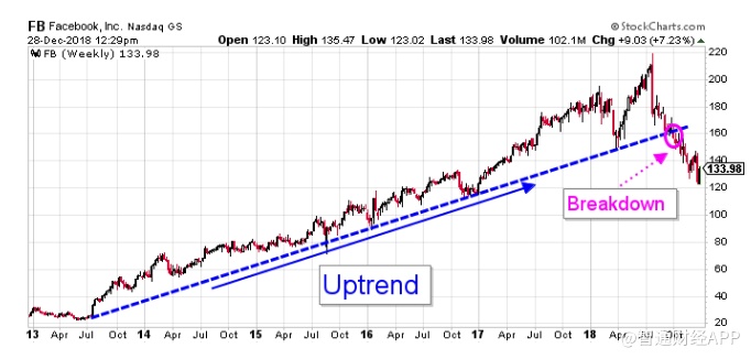 2018年10月8日,Facebook股票跌破了上涨趋势线。这一扭转表明,2013年开始的上涨趋势可能将被下跌趋势所取代。