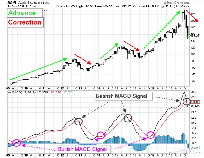 上面的图表清楚地表明,当MACD指标指示上涨时,苹果股票出现了上涨。当指示下跌时时,该股会出现调整。