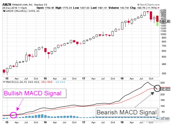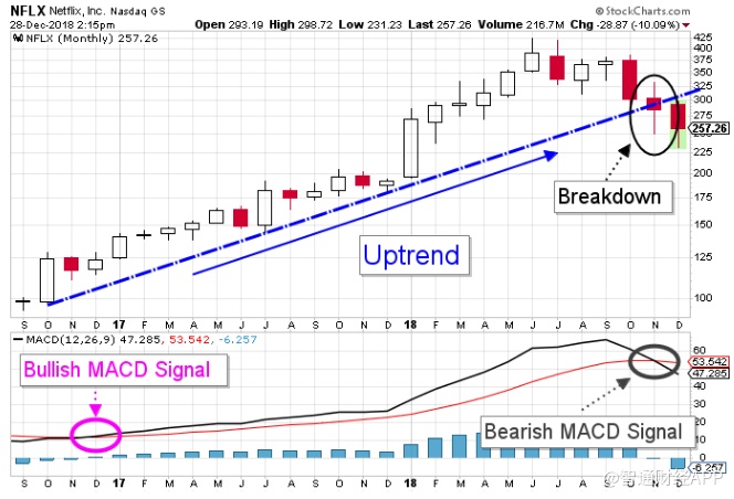 2018年11月,Netflix跌破上升趋势线,发出看跌的MACD信号。