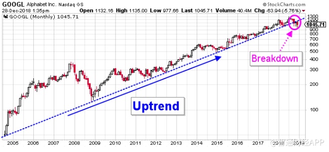 不幸的是,谷歌股票在2018年10月跌破了上升趋势线。这表明,2004年8月开始的上涨趋势最终为调整和下跌趋势打开了大门。
