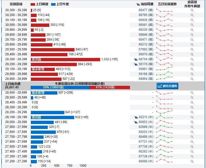 智通财经APP获悉,截至3月13日,恒指最新的牛熊街货比例59:41。从瑞信恒指牛熊证街货分布图中得到的数据显示,熊证街货重货区在29300-29399区间,该区间最新熊证数量为1332张,较上一交易日减少105张;最多新增区间在29100-29199区间。牛证街货重货区在28100-28199区间,该区间最新牛证数量为832张,比上一交易日增加45张;最多新增也在28600-28699区间。