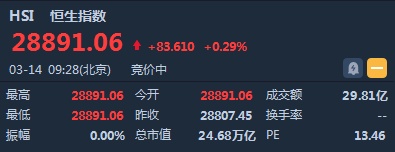智通财经APP获悉,恒生指数开盘涨0.29%,报28891.06点。国企指数涨0.44%,报11455.59点。红筹指数涨0.54%,报4512.33点。大市盘前成交29.81亿港元。隔夜美股,三大股指全线收涨。标普500指数三连涨,创四个多月以来新高。