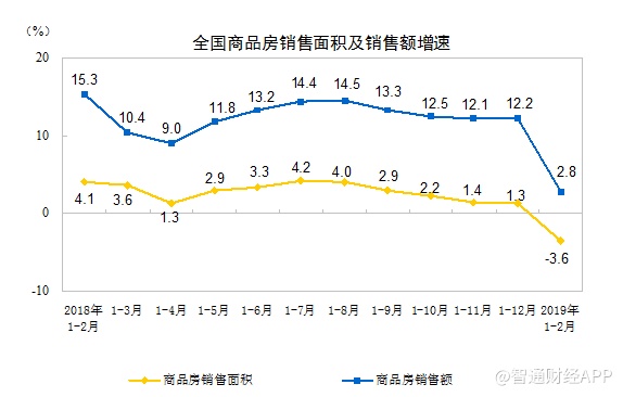 1-2月份,商品房销售面积14102万平方米,同比下降3.6%,2018年全年为增长1.3%。其中,住宅销售面积下降3.2%,办公楼销售面积下降15.7%,商业营业用房销售面积下降13.6%。商品房销售额12803亿元,增长2.8%,增速回落9.4个百分点。其中,住宅销售额增长4.5%,办公楼销售额下降6.2%,商业营业用房销售额下降9.4%。