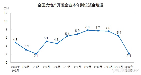 1-2月份,房地产开发企业到位资金24497亿元,同比增长2.1%,增速比2018年全年回落4.3个百分点。其中,国内贷款4976亿元,下降0.5%;利用外资52亿元,增长3.3倍;自筹资金7279亿元,下降1.5%;定金及预收款7366亿元,增长5.6%;个人按揭贷款3458亿元,增长6.5%。