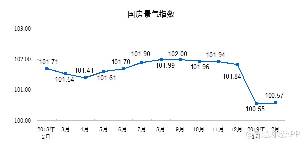 2月份,房地产开发景气指数(简称“国房景气指数”)为100.57,比2018年12月份回落1.27点。