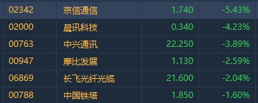 智通财经APP获悉,5G概念股近日延续弱势回调格局,截至发稿,京信通信(02342)跌5.43%,晨讯科技(02000)跌4.23%,中兴通讯(00763)跌3.89%,摩比发展(00947)、长飞光纤光缆(06869)跌超2%,中国铁塔(00788)跌1.6%。