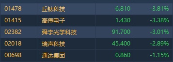 智通财经APP获悉,手机设备股今日普跌,截至发稿,丘钛科技(01478)跌3.81%,高伟电子(01415)跌3.38%,舜宇(02382)跌3.01%,通达集团(02018)跌1.15%。