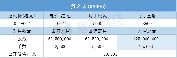 智通财经APP获悉,3月14日,连锁餐饮运营商赏之味(08096)配售结束。配售招股价区间为0.4-0.7港元,最终定价0.7港元,每手3500港元。