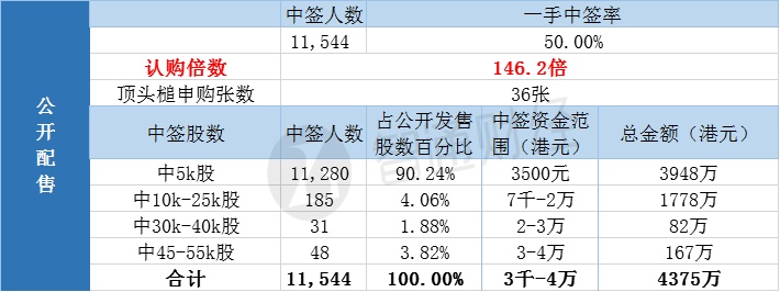 其中,公开配售申购人数21595,一手中签率50%,超购倍数146.2倍。