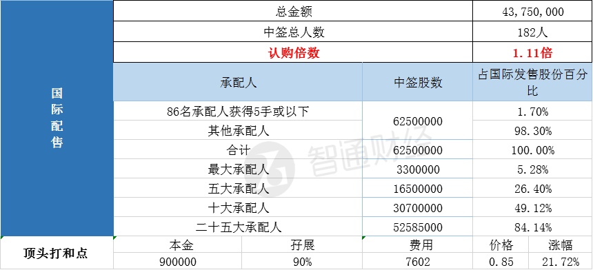 国际配售申购人数182,超购倍数1.11倍。