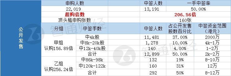 其中,公开配售申购人数为2.20万,一手中签率50%,认购倍数206.56倍。