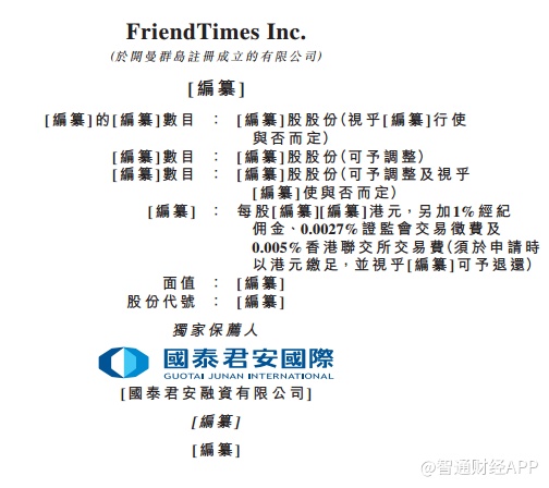 智通财经APP获悉,据港交所3月13日披露,FriendTimes Inc.向港交所递交上市申请,国泰君安国际为其独家保荐人。