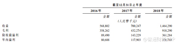 截至2016年、2017年以及2018年12月31日止年度,公司录得收益分別约为人民币5.69亿元、7亿元以及14.64亿元,年复合增长率60.5%。毛利分别为3.58亿元、4.32亿元及9.18亿元,毛利率分別为63%、61.7%以及62.7%。年內溢利为8068.8万元、1.18亿元以及3.37亿元,年复合增长104.3%,净利率分别为14.2%、16.8%及23.0%。