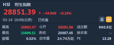 智通财经APP获悉,恒指早盘高开0.29%,报28891.06点。截至收盘,恒生指数涨0.15点或43.94%,报28851.39点,全日成交额达960.51亿。国企指数涨0.36%,报11447.27点,红筹指数涨0.56%,报4513.25点。