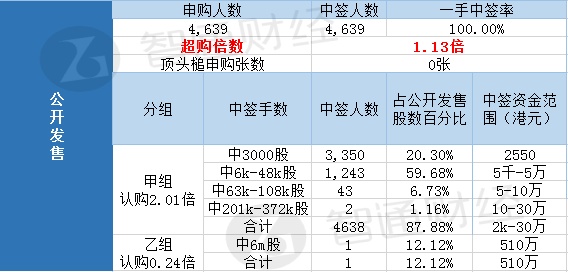 其中,公开配售申购人数为4639,一手中签率100%,认购倍数1.13倍。