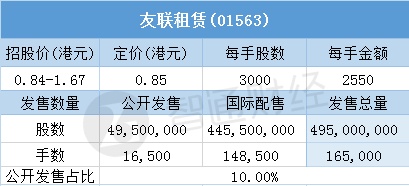智通财经APP获悉,3月14日,友联租赁(01563)配售结束。配售招股价区间为0.84-1.67港元,最终定价0.85港元,每手2550港元。
