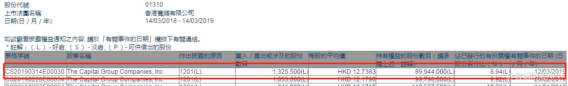 智通财经APP获悉,根据联交所资料显示,The Capital Group于3月12日减持香港宽频(01310)132万股,每股作价12.74港元,总值1681.68万港元,最新持股数目8994.4万股,最新持股比例减至8.94%。