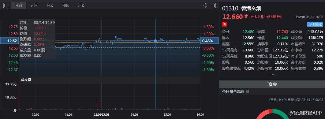 截至今日收盘,香港宽频(01310)涨0.80%,报12.66港元。