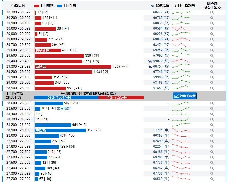 智通财经APP获悉,截至3月14日,恒指最新的牛熊街货比例59:41。从瑞信恒指牛熊证街货分布图中得到的数据显示,熊证街货重货区在29300-29399区间,该区间最新熊证数量为1367张,较上一交易日减少77张;最多新增区间在29600-29699区间。牛证街货重货区在28100-28199区间,该区间最新牛证数量为917张,比上一交易日减少292张;最多新增也在28500-28599区间。