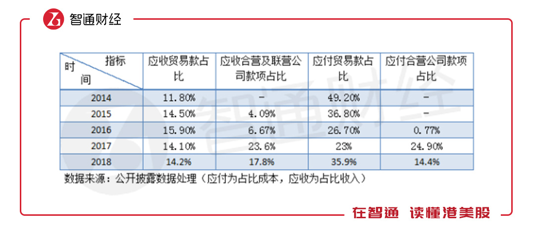 智通财经APP透过时代中国控股历年财报了解到,2017年开始,该公司存在大量和合营及联营公司的关联交易,且大都是应收应付的形式。2017年,应收合营及联营公司占比收入从2016年的6.67%上升至23.6%,2018年仍高达17.8%,比一般的应收款项占比要大。