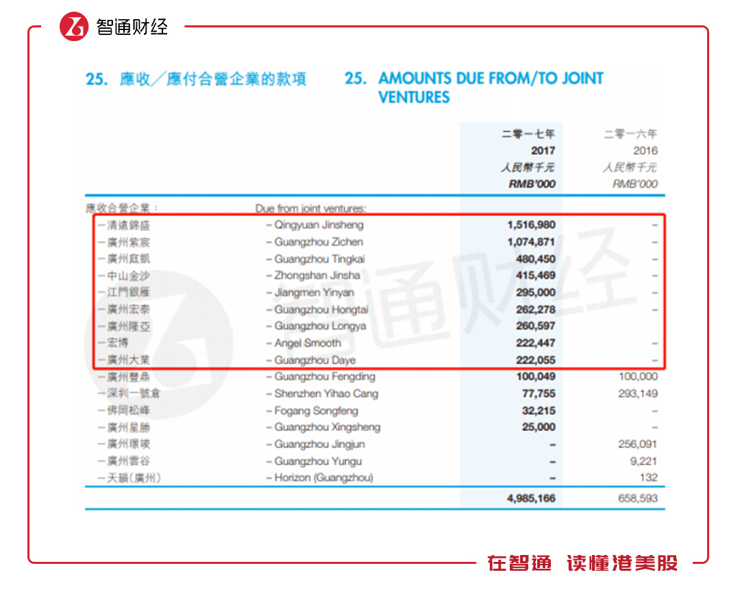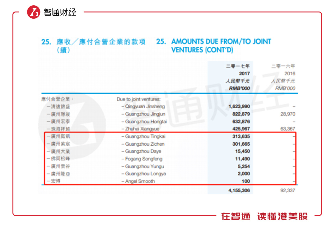 时代中国控股此次发布的2018年财报,并未公布与合营及联营公司交易的具体情况,但2017年是有公布的。2017年该公司应收合营公司49.85亿元,主要交易对象是清远锦盛和广州紫宸,应收分别为15.17亿元和10.75亿元,应付合营公司41.55亿元,主要交易对象是清远锦盛和广州璟竣,应付金额分别是16.24亿元和8.23亿元。