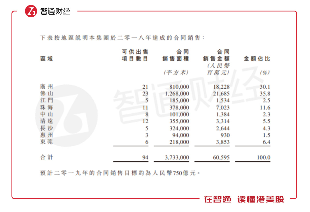 智通财经APP了解到,时代中国控股的主要项目集中在广东地区,2018年,该公司共有99个处于不同阶段的项目,其中有96个项目位于广东,2个项目位于湖南长沙以及1个项目位于四川成都。按2018年达成的合同销售看,可供出售94个项目,其中广东有89个项目,合同销售金额占比95.6%。