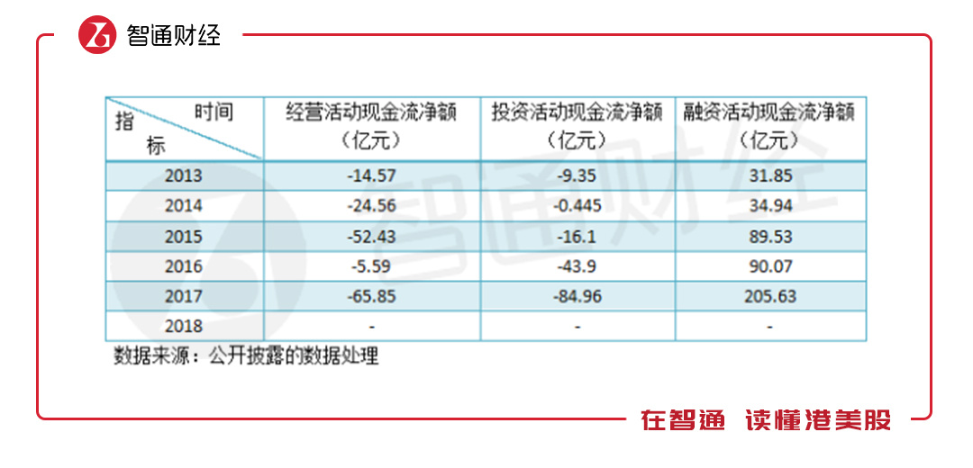 2018年并未公布现金流量表,但可以大致推算或仍为负数。2018年金融性负债(包括长短期)增加了143.42亿元,按照2017年现金等价物为142.63亿元,而彼时现金及等价物为233.74亿元,三项现金流净额合计91.11亿元,扣去融资现金流后,投资及经营现金流净额大致合计为-52.31亿元。