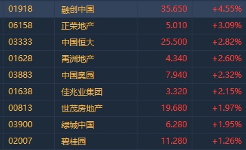 智通财经APP获悉,内房股今日随大市走升,截至发稿,融创中国(01918)涨4.55%,正荣地产(06158)涨3.09%,中国恒大(03333)、禹洲地产(01628)、佳兆业(01638)涨超2%。