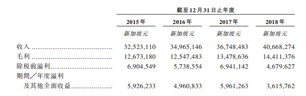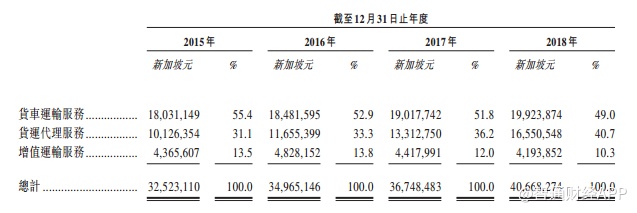 据招股书显示,截至2018年12月31日止四个年度,公司的收入分别约为3252万元(新加坡元.下同)、3497万元、3675万元及4067万元;其中货车运输服务占总收入的一半左右,分别为55.4%、52.9%、51.8%及49.0%,货运代理服务分别为31.1%、33.3%、36.2%及40.7%,其余为增值运输服务收入。
