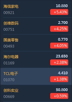智通财经APP获悉,家电补贴进入实操阶段,A股家电板块午后走强,H股跟涨。截至14时23分,海信家电(00921)涨5.23%,报价10.86港元,创维数码(00751)涨4.25%,国美零售(00493)涨4.05%,海尔电器(01169)涨2.16%,TCL电子(01070)涨1.61%。